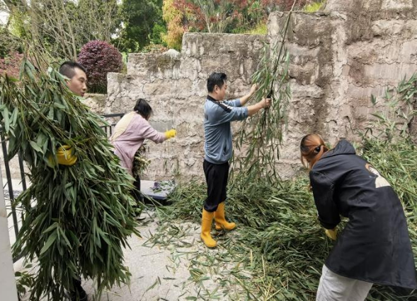 丰容工作秉持生态环保、因地制宜原则,充分利用熊猫馆使用后的废弃竹枝,搭配成品草窝、稻草、枯枝及橡皮桶等材料,依据不同雉类特性,定制搭建大小适配的生态巢穴。在外区沙地(非防雨区域),采用半埋式橡皮桶内置枯树叶,外层以竹枝、竹叶严密遮掩,打造兼具避雨与隐蔽性的巢穴;在内区(防风雨区域),以成品草窝为基底,用竹枝竹叶遮挡隐蔽,窝内铺设稻草、放置假蛋,模拟温暖安全的繁育环境;针对体型较大的绿孔雀,依托圈舍内树木支撑,用竹枝搭建2个带隐蔽通道的大型专属巢穴。