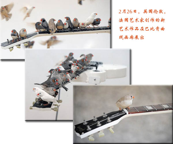 这个作品是让一些小鸟停在电吉他上,靠它们的来回跳动制造出与众不同的旋律。