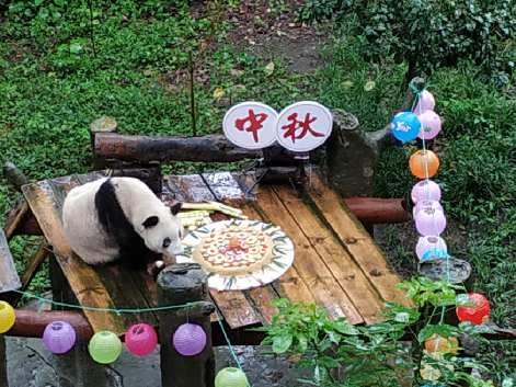 “新星”是全球现存最年长的大熊猫,号称熊猫界的 “百岁老人”。9月24日正值中秋节,我园邀请猫粉和游客一起与“新星”过佳节。活动环节为:一是听保育员讲“新星”的故事。掌握大熊猫科学知识。二是看食材。了解“新星”的健康营养食谱。三是做专属月饼。窝窝头、苹果、圣女果、竹笋、竹叶等食材齐上阵。四是送月饼。由保育员为 “新星”送上美味可口的定制月饼。五是品美食。邀参与者们与大熊猫“新星”一起品月饼,过中秋。