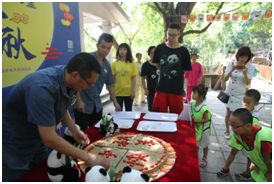 主题活动在熊猫馆举行,主要包括三个环节:一是现场为大熊猫制作专属月饼。根据大熊猫的饮食特点和喜好,工作人员利用窝窝头、苹果、圣女果、胡萝卜、竹笋等食材,为大熊猫“四世”的代表(老祖母“新星”、子辈“灵灵”、孙辈“好奇”、曾孙辈“渝宝、渝贝”)制作月饼。游客们纷纷驻足观看,对食材充满好奇。为此,现场工作人员详细介绍了原料及制作过程。美味可口的月饼做好后,由保育员将月饼送到熊猫家。一看到月饼,大熊猫们便毫不客气地品尝起来,围观的游客们看得喜滋滋!二是熊猫科普小课堂。科普教员详细介绍了熊猫的相关知识:名字的来由、身体特征、食性等等,深入浅出的讲解让现场的大朋友、小朋友都听得津津有味!三是手工陶泥制作熊猫团圆大家庭。参与者以五人为一组,利用软陶,捏出大熊猫“四世同堂”代表个体,组合成大家庭过中秋的场景,与大熊猫一起过中秋。在科普教员的指导下,参与者们充分发挥想象力,以自己的独特构思、灵巧双手,用平平无奇的陶泥,制作出了生动传神的熊猫作品。
