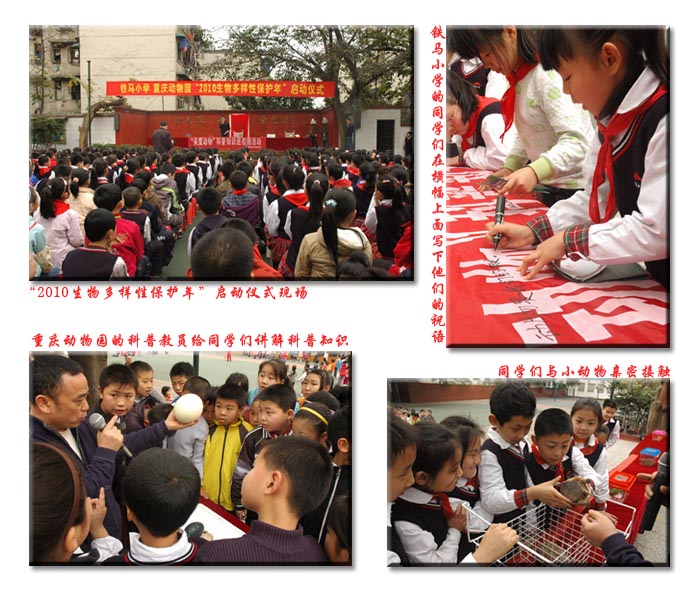 2010年3月2日,重庆动物园与铁马小学联合举办了2010国际生物多样性年倒计时启动仪式。动物园科普工作人员来到校园,与铁马小学师生共同开展生动的保护教育课堂。