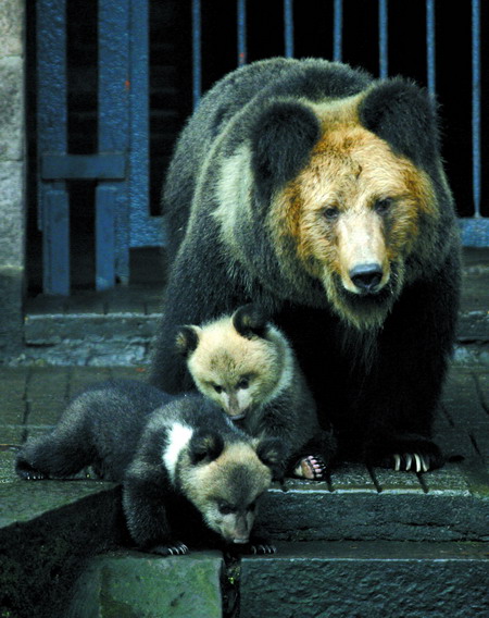昨天马熊夫妻的小宝宝满3个月,首次和游客见面,引来的大批游客极大的兴趣。只看到马熊妈妈走在前面三步一回头的,带着两个走路还有点跌跌撞撞小家伙,进入大家的视线,马熊妈妈的警戒性有点高,谨慎而细心的照顾两个小宝宝,一有什么奇怪的声响它就显得很机警,马上就站到两个宝贝的前面生怕它们受到半点伤害。当它发现周围环境安详和谐的时候,开始给它们锻炼的机会、教他们捕食本领。当宝贝不听招呼的时候,只听见熊妈妈一发出“哧哧”的呼唤声,两个小家伙马上就乖乖的跟了上来,非常听话;在吃东西的时候,妈妈还会留一半食物给它们,让他们自己学习吃东西的本领。小家伙们觉得什么都很新鲜,不住地用圆乎乎的大脑袋东张西望,非常可爱。