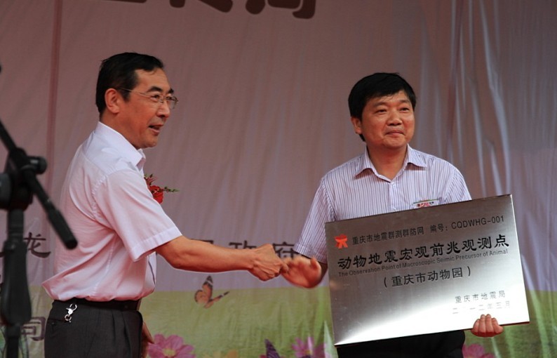 市地震局陈局长为重庆动物园颁发动物震前宏观前兆观测点