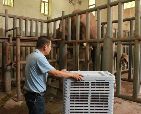 亚洲象也受不了重庆的连晴高温。为了帮助大象顺利度夏,动物园今年在大象馆新安装制冷机,用冷风机给大象降温。