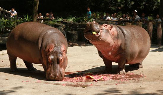 大象的“非洲兄弟”河马虽然整天泡在水池里,还是难以忍受闷热的天气。聪明的河马会用冰西瓜缓解夏天的炎热。