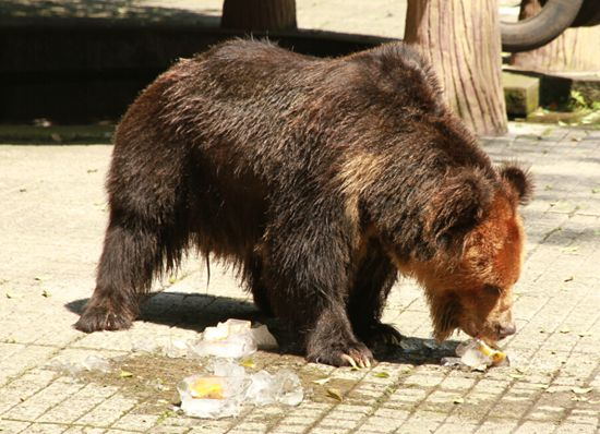 可爱的棕熊夫妇吃上了大块美味的“水果冰糕”。