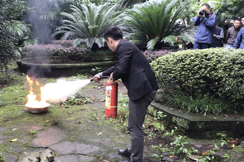 人员疏散演练后,在行政办公楼前小广场举行了油盆灭火演练。由殷毓中副处长随机抽取男、女义务消防队员各一名,示范如何正确使用灭火器。