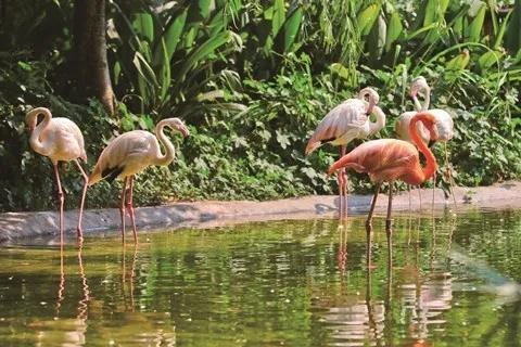 有优雅的火烈鸟在水池边旁若无人梳妆